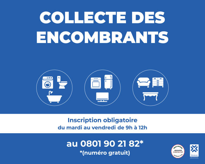 Un ramassage gratuit des encombrants (meubles, ferraille, gros électroménager, etc.) est organisé sur l’ensemble du territoire de l’Agglomération toutes les semaines.